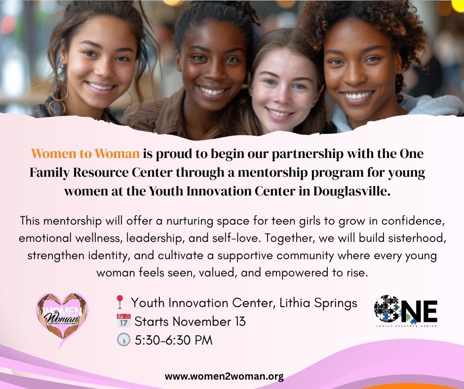 Women to Woman is honored to partner with the One Family Resource Center to launch a mentorship circle for teen girls at the Youth Innovation Center in Lithia Springs.